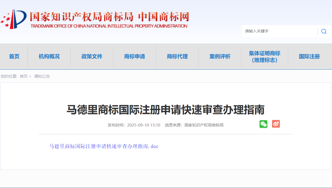 9月10日下午,国家知识产权局商标局发布《马德里商标国际注册申请快速审查办理指南》。《指南》明确,具有《商标注册申请快速审查办法》第二条规定情形之一,申请人有商标海外注册或商标海外维权需求的,可以请求马德里商标国际注册申请快速审查。