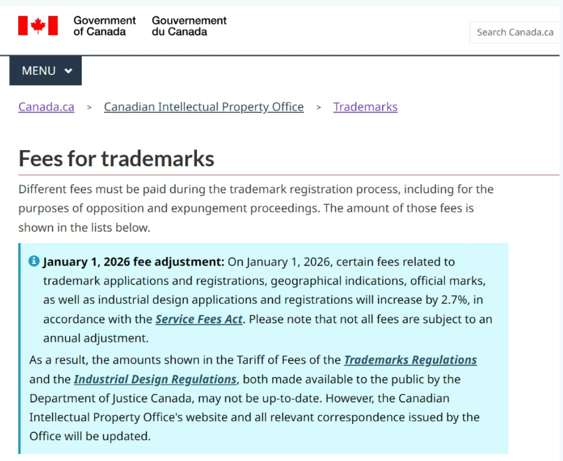 近日,加拿大知识产权局(CIPO)官网公布,专利、商标及外观设计等各项官费将于2026年1月1日再次上调,涨幅为2.7%。