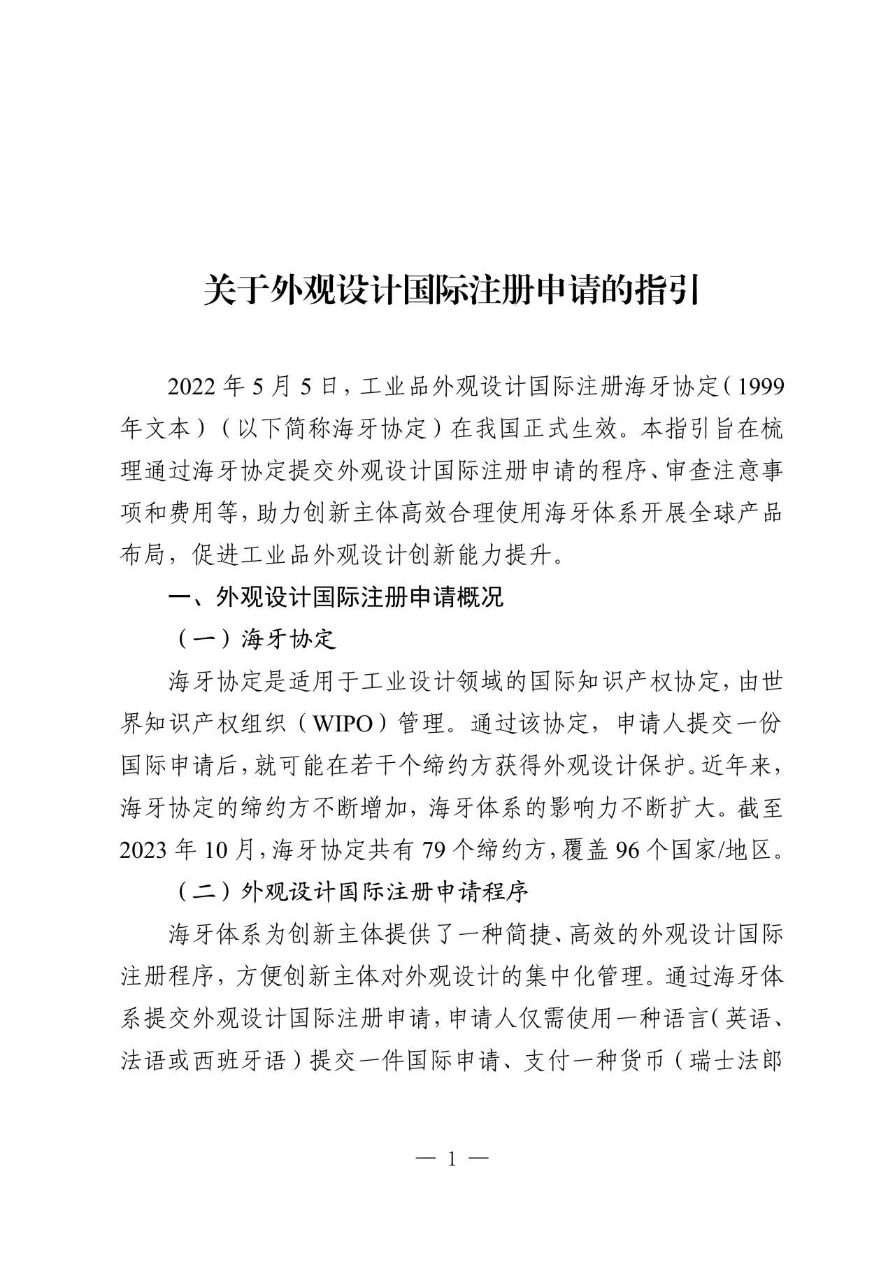 为深入贯彻落实《“十四五”国家知识产权保护和运用规划》任务部署,加强知识产权源头保护,强化知识产权申请注册质量监管,助力创新主体高效合理使用海牙体系开展全球产品布局,促进外观设计创新能力提升,国家知识产权局组织编写了《关于外观设计国际注册申请的指引》,供相关创新主体参考使用。