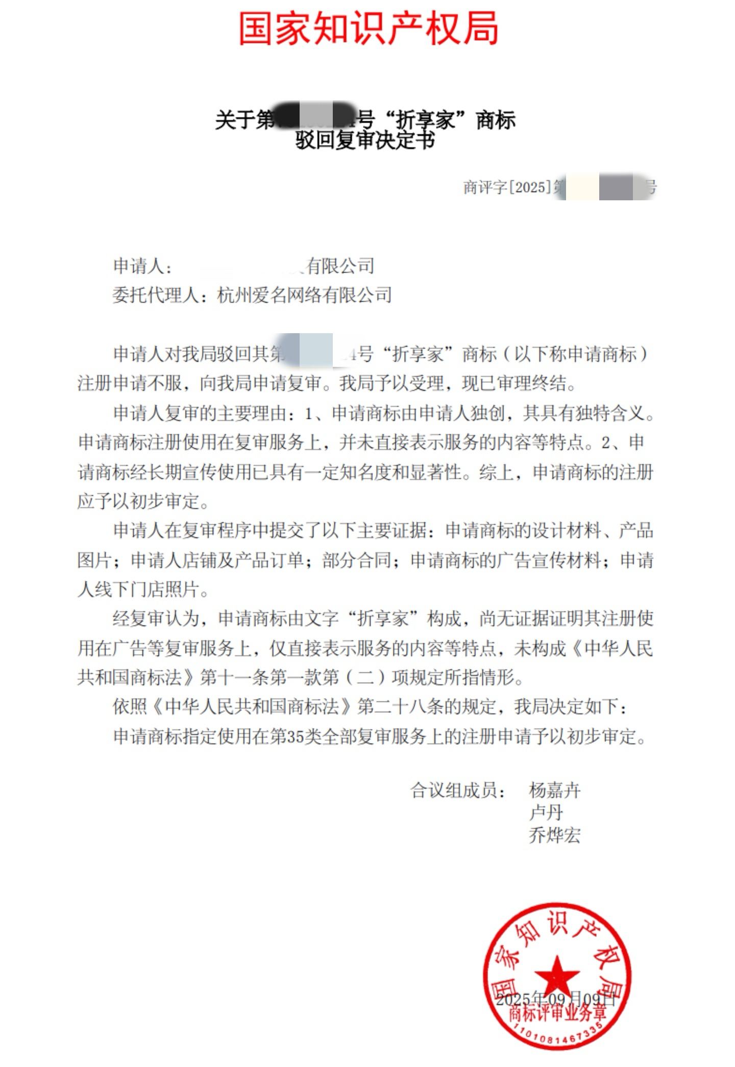 长沙一公司申请“折享家”商标被驳回,委托我司代理申请商标驳回复审,近期已收到商标局下发的驳回复审决定书,申请商标成功通过复审,予以初步审定。一起来看一下这件商标是如何复审成功的吧。
