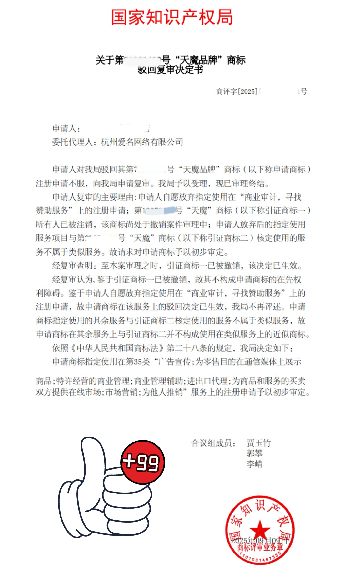 通过和申请人沟通,这些重合的小类非核心业务,为了保证申请商标获得注册,可以放弃这些重合的小类,从而使得申请商标在其余类别上获准注册。据此,我司代为撰写和提交了驳回复审申请材料。