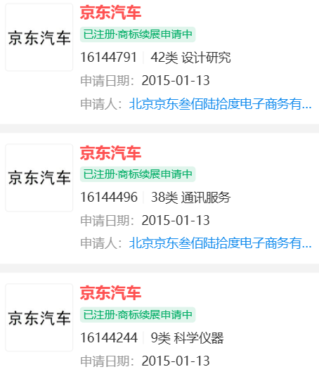 1、10月14日,京东宣布联合宁德时代旗下的时代电服和广汽集团,在11月9日共同推出一款新车。一时间引发热议,京东也要造车了?构卓查询发现京东早在2015年就申请注册多件“京东汽车”商标,后续又陆续注册“京东汽车 CAR.JD.COM”、“京东汽车商城”等商标,很多已成功注册。