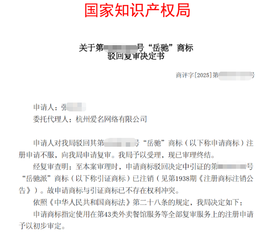复审时,商标局查明引证商标已注销,故申请商标与引证商标已不存在权利冲突。最终,商标局决定对申请商标“岳驰”予以初步审定。