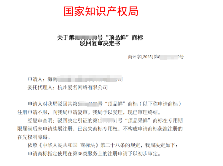 商标驳回不是终点,仔细分析驳回原因,评估复审成功率是关键。今天,给大家分享我司近期成功代理的“顶品鲜”商标驳回复审案件。