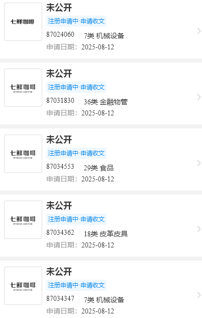 除“七鲜咖啡”外,该公司近期还提交了“参宫鲍”“七鲜私厨参宫鲍”“七鲜合伙人”“合灶人”“七鲜满分”等一系列新商标申请,覆盖餐饮、合伙人计划、餐饮供应链等多个业务方向。