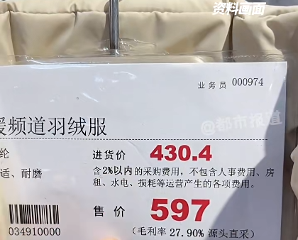 据悉,胖东来超市自营羽绒服,每件都标有进货价和毛利率,还带有质检报告,吊牌会直接写清 “进价430元,售价597元”,众多网友被“种草”。这些羽绒服大部分为鸭绒羽绒服,含绒量高达90%,价格也在几百至上千元不等。