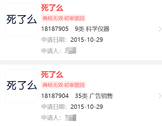 有意思的是,构卓查询发现,早在2015年就有人申请注册“死了么”商标,注册在第9类和35类。不过让人遗憾的是,“死了么”商标没有通过商标局审查,被商标局驳回,目前已经无效。