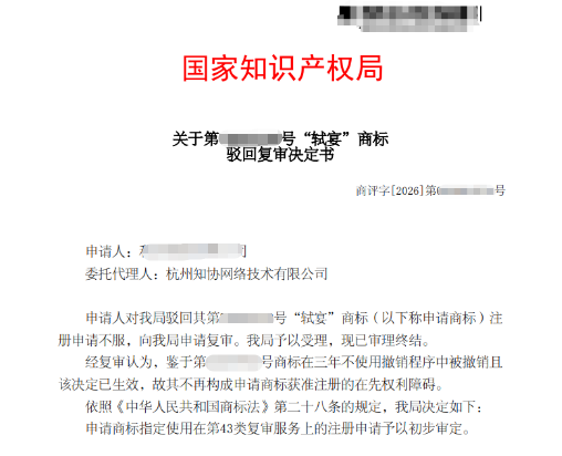 申请商标时遇到在先近似商标,撤三+复审是一种常见的应对策略。近日,构卓成功代理一起类似案例,目前已收到商标局下发的商标驳回复审通知书。一起来看下。